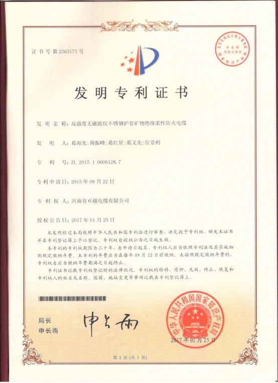 喜訊——“無機(jī)防火套型礦物絕緣柔性防火電纜”獲國家發(fā)明**
